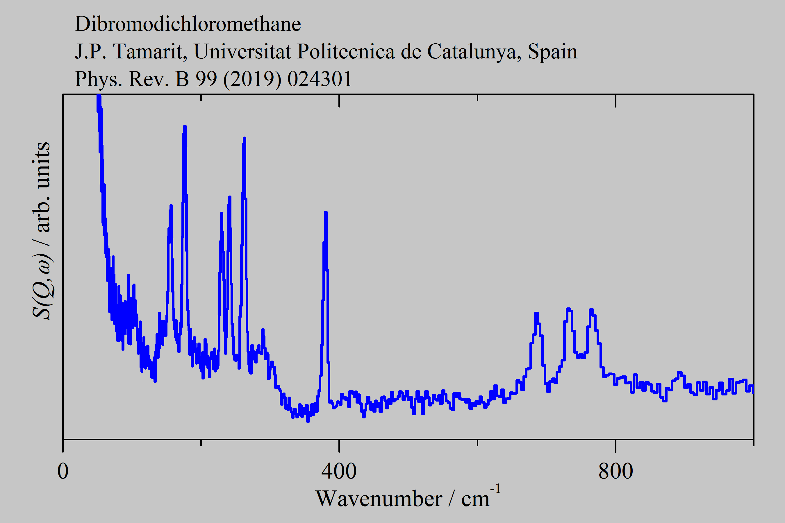 Inelastic Neutron Scattering spectrum of Dibromodichloromethane, CBr2Cl2, measured on the TOSCA instrument.