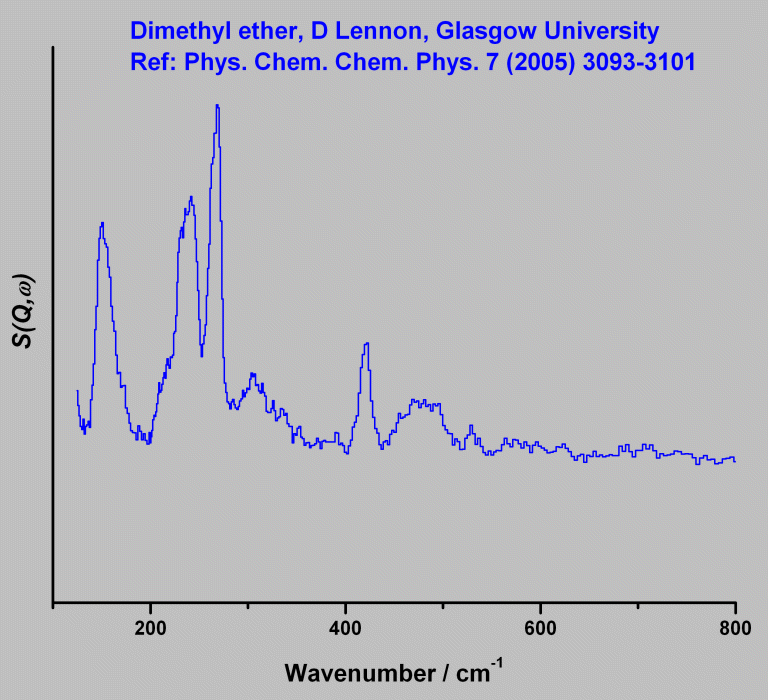 Inelastic Neutron Scattering spectrum of Dimethylether, CH₃OCH₃, measured on the TOSCA instrument.