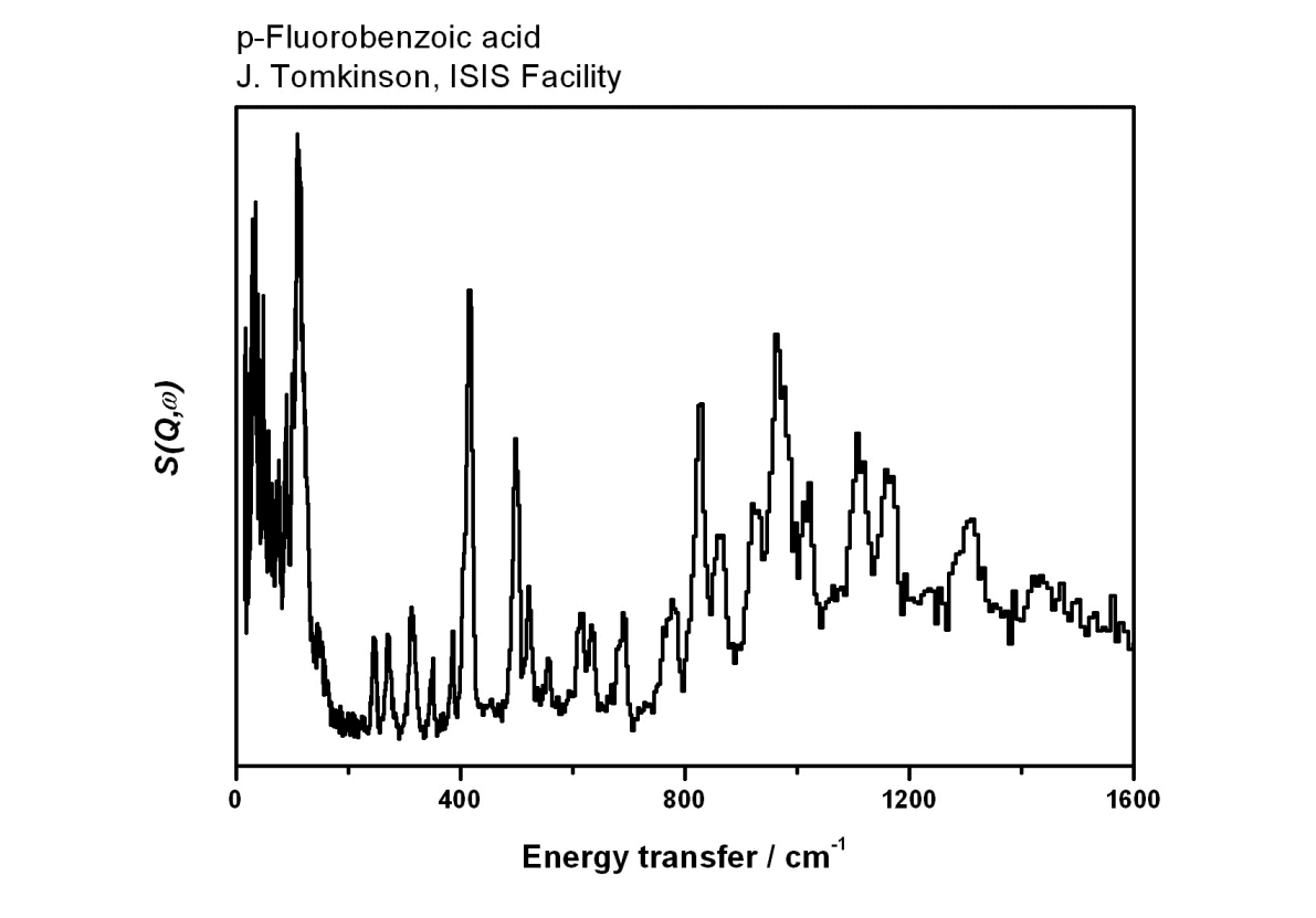 Inelastic Neutron Scattering spectrum of p-Fluorobenzoic acid, F-C₆H₄-CO₂H, measured on the TFXA instrument.