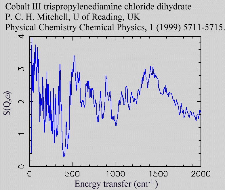 Inelastic Neutron Scattering spectrum of Cobalt (III) trispropylenediamine chloride dihydrate, C₉H₃₀Cl₃CoN₆, measured on the TFXA instrument.