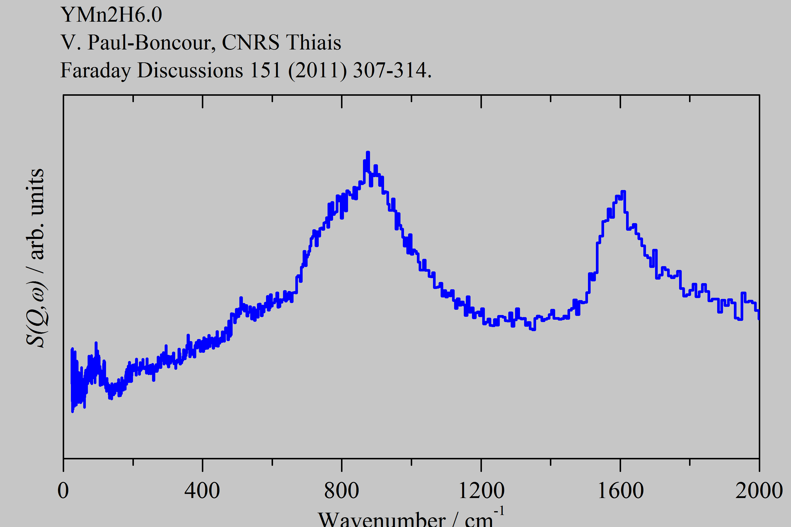 Inelastic Neutron Scattering spectrum of Yttrium manganese hydride x=6.0, YMn2H6.0, measured on the TOSCA instrument. Ionic material Fm-3m space group: (Y,Mn)[MnH6], Y2+ and Mn2+ are disordered on the tetrahedral sites and [MnH6]2- ions occupy the octahedral sites..