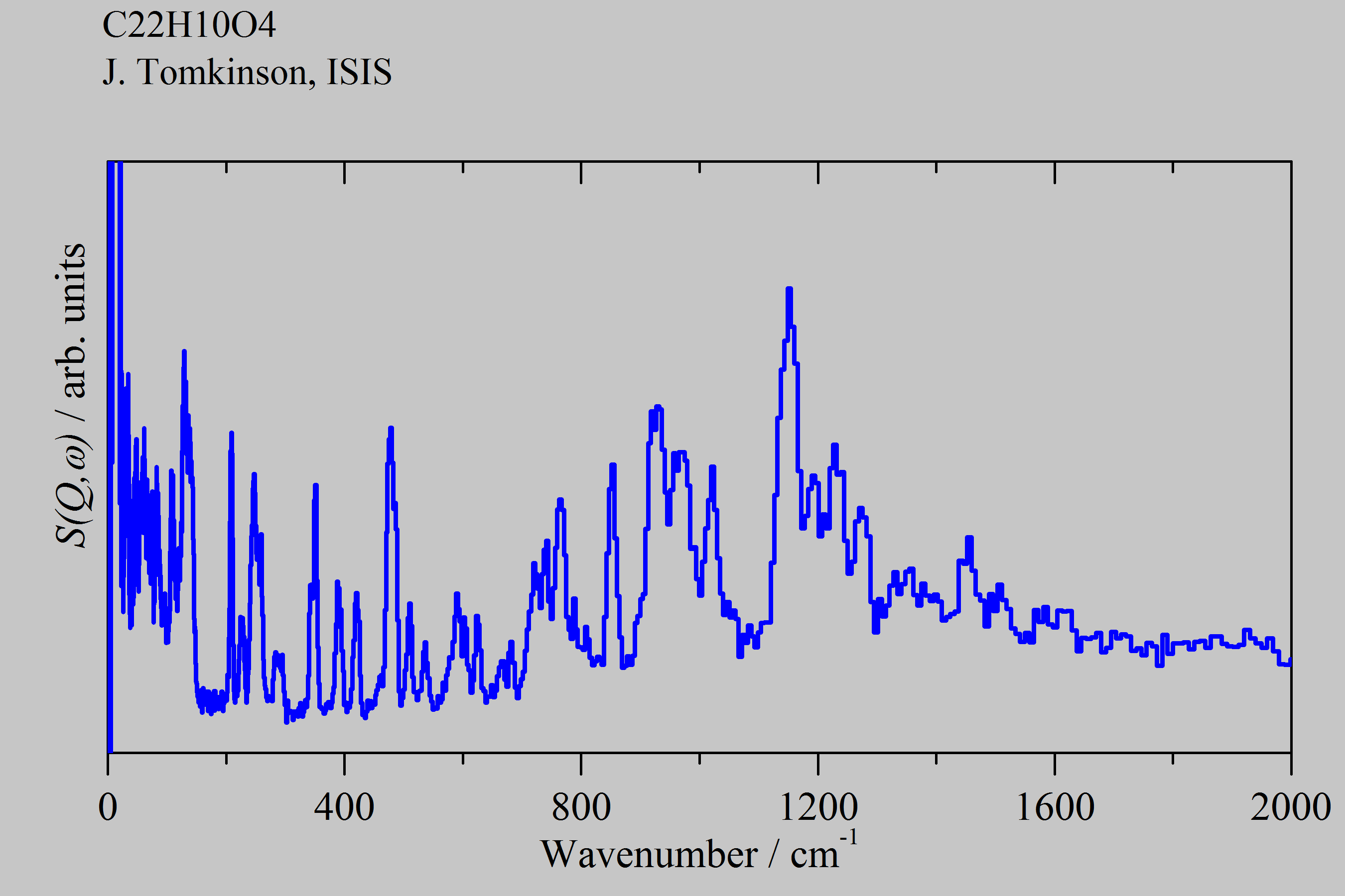 Inelastic Neutron Scattering spectrum of Pentacene-5,7,12,14-tetraone, C₂₂H₁₀O₄, measured on the TOSCA instrument.