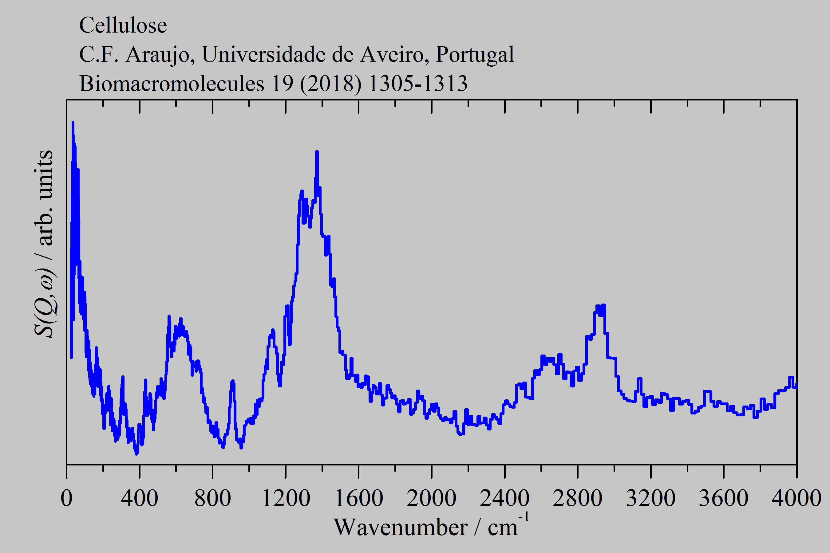 Inelastic Neutron Scattering spectrum of Cellulose, (C6H10O5)n, measured on the TOSCA instrument.