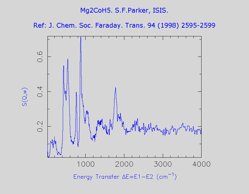 Inelastic Neutron Scattering spectrum of Magnesium pentahydridocobalt (I), Mg₂COH₅, measured on the TFXA instrument.