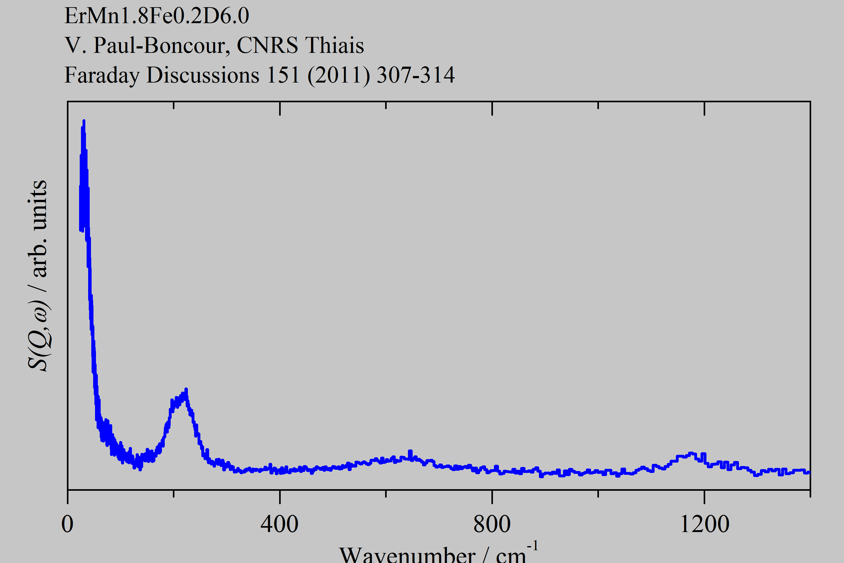 Inelastic Neutron Scattering spectrum of Erbium manganese iron deuteride x=6.0, ErMn1.8Fe0.2D6.0, measured on the TOSCA instrument. Ionic material Fm-3m space group: (Er,Mn)[MnD6]1.8[FeD6]0.2, Er2+ and Mn2+ are disordered on the tetrahedral sites while [MnD6]2- and [FeD6]2- ions occupy the octahedral sites. The peak at ~200 cm-1 is a crystal field excitation, not a phonon..