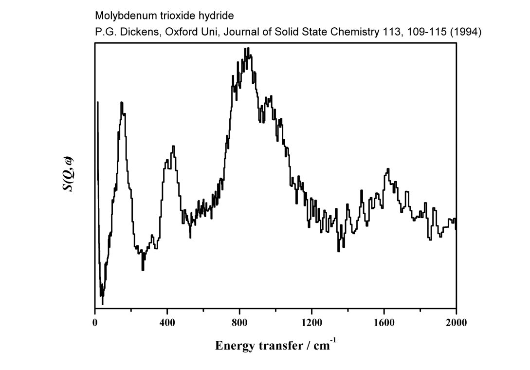 Inelastic Neutron Scattering spectrum of Molybdenum trioxide hydride, H1.7MoO3, measured on the TFXA instrument.