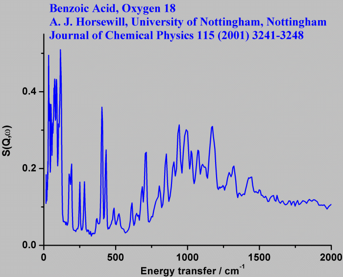 Inelastic Neutron Scattering spectrum of Benzoic acid O18, C₆H₅CO₁₈O₁₈H, measured on the TFXA instrument.