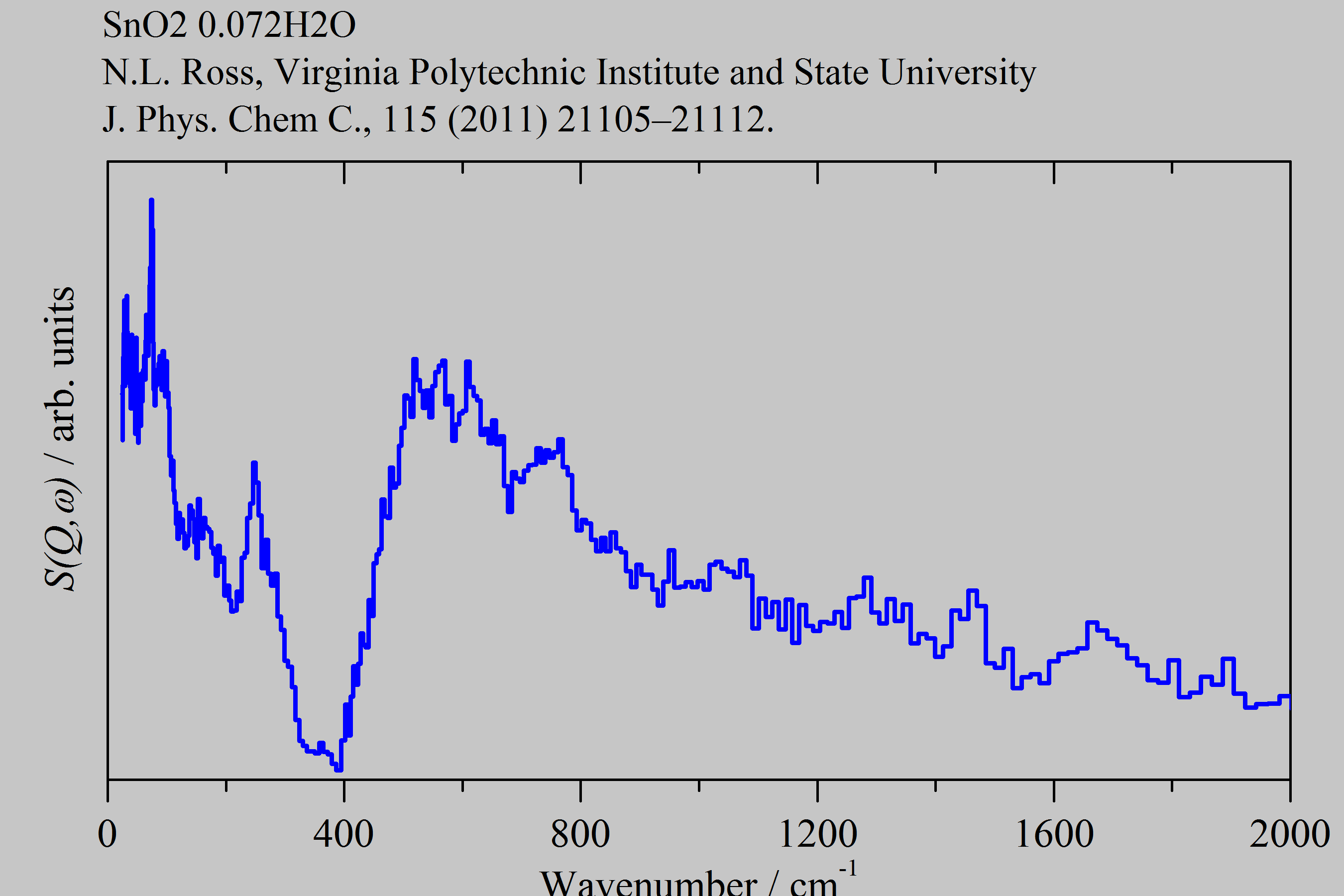 Inelastic Neutron Scattering spectrum of Hydrous cassiterite 20nm low water, SnO2 0.072H2O, measured on the TOSCA instrument. Core (20 nm SnO2) shell (H2O) structure.
