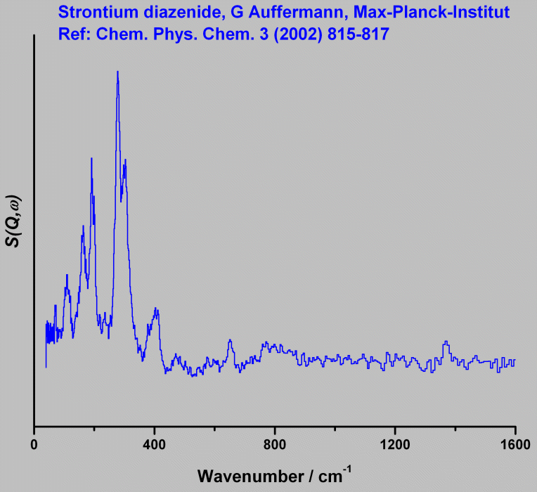 Inelastic Neutron Scattering spectrum of Strontium diazenide, SrN, measured on the TOSCA instrument. Actual Molecular formula: Sr4(N)2(N2). N-N Stretch at 1375cm-1.