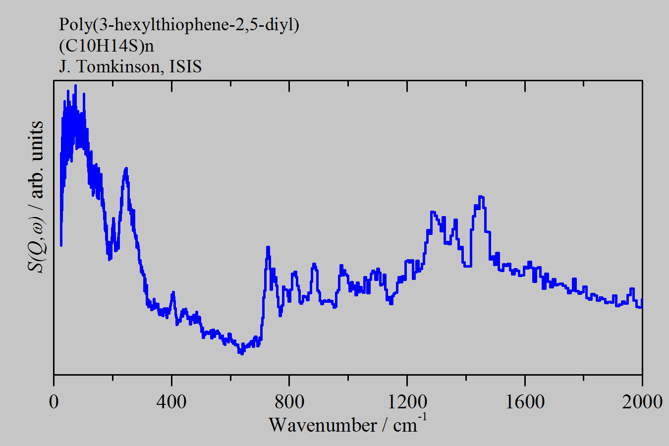 Inelastic Neutron Scattering spectrum of Poly(thiophene-3-hexyl-2,5-diyl), (C₁₀H₁₄S)n, measured on the TOSCA instrument. P3HT.