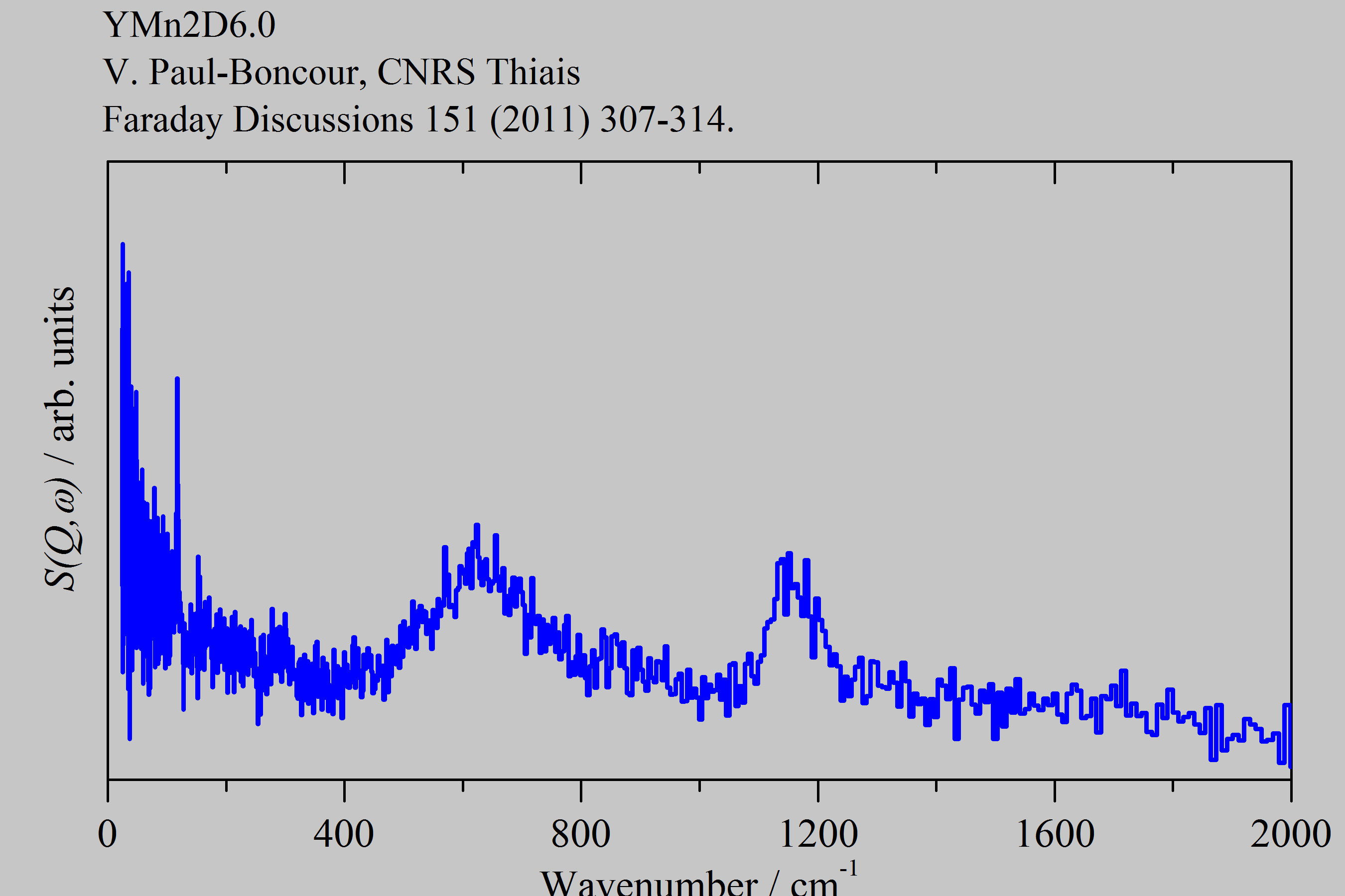 Inelastic Neutron Scattering spectrum of Yttrium manganese deuteride x=6.0, YMn2D6.0, measured on the TOSCA instrument. Ionic material Fm-3m space group: (Y,Mn)[MnD6], Y2+ and Mn2+ are disordered on the tetrahedral sites and [MnD6]2- ions occupy the octahedral sites..