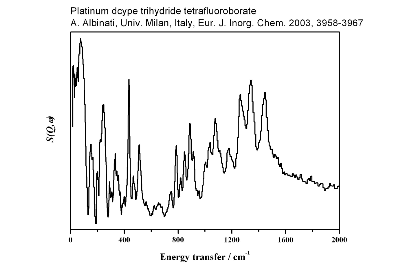 Inelastic Neutron Scattering spectrum of Platinum dcype trihydride tetrafluoroborate, [Pt₂(dcype)₂(H)₃][BPh₄], measured on the TOSCA instrument. dcype = 1,2-Bis(dicyclohexylphosphanyl)ethane.