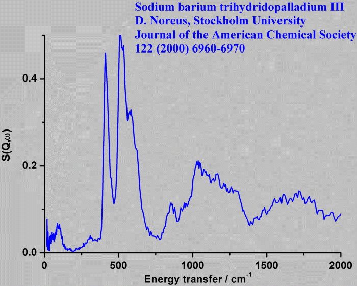 Inelastic Neutron Scattering spectrum of Sodium barium trihydridopalladium (III), NaBaPdH₃, measured on the TFXA instrument.