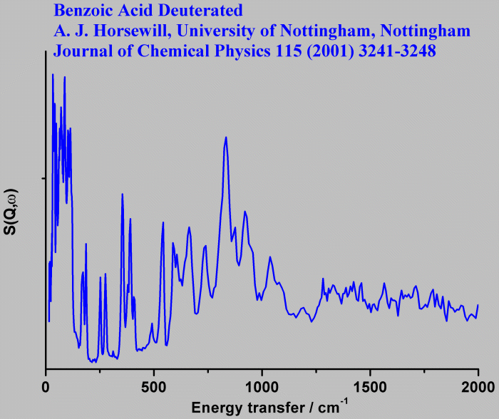 Inelastic Neutron Scattering spectrum of Benzoic acid deuterated, C₆D₅COOD, measured on the TFXA instrument.