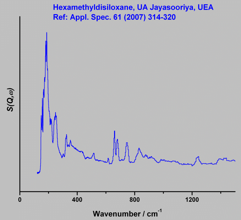 Inelastic Neutron Scattering spectrum of Hexamethyldisiloxane, (CH₃)₃SiOSi(CH₃)₃, measured on the TOSCA instrument.