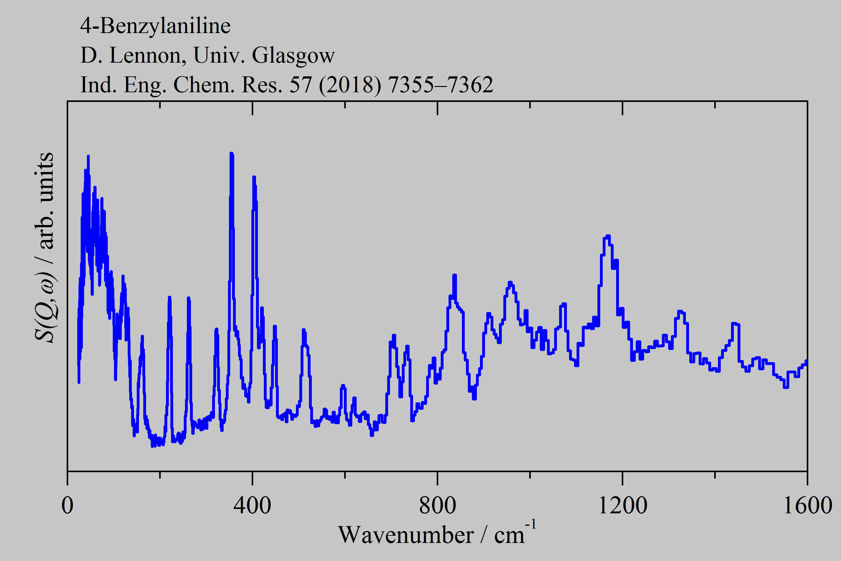 Inelastic Neutron Scattering spectrum of 4-Benzylaniline, C6H4CH2C6H4NH2, measured on the TOSCA instrument.