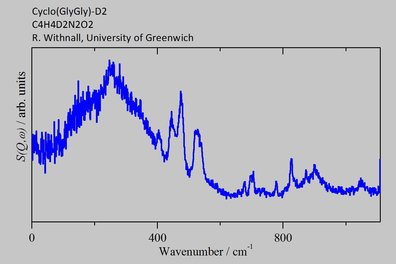 Inelastic Neutron Scattering spectrum of Cyclo(GlyGly)-D2, C₄H₄D₂N₂O₂, measured on the TOSCA-1 instrument.