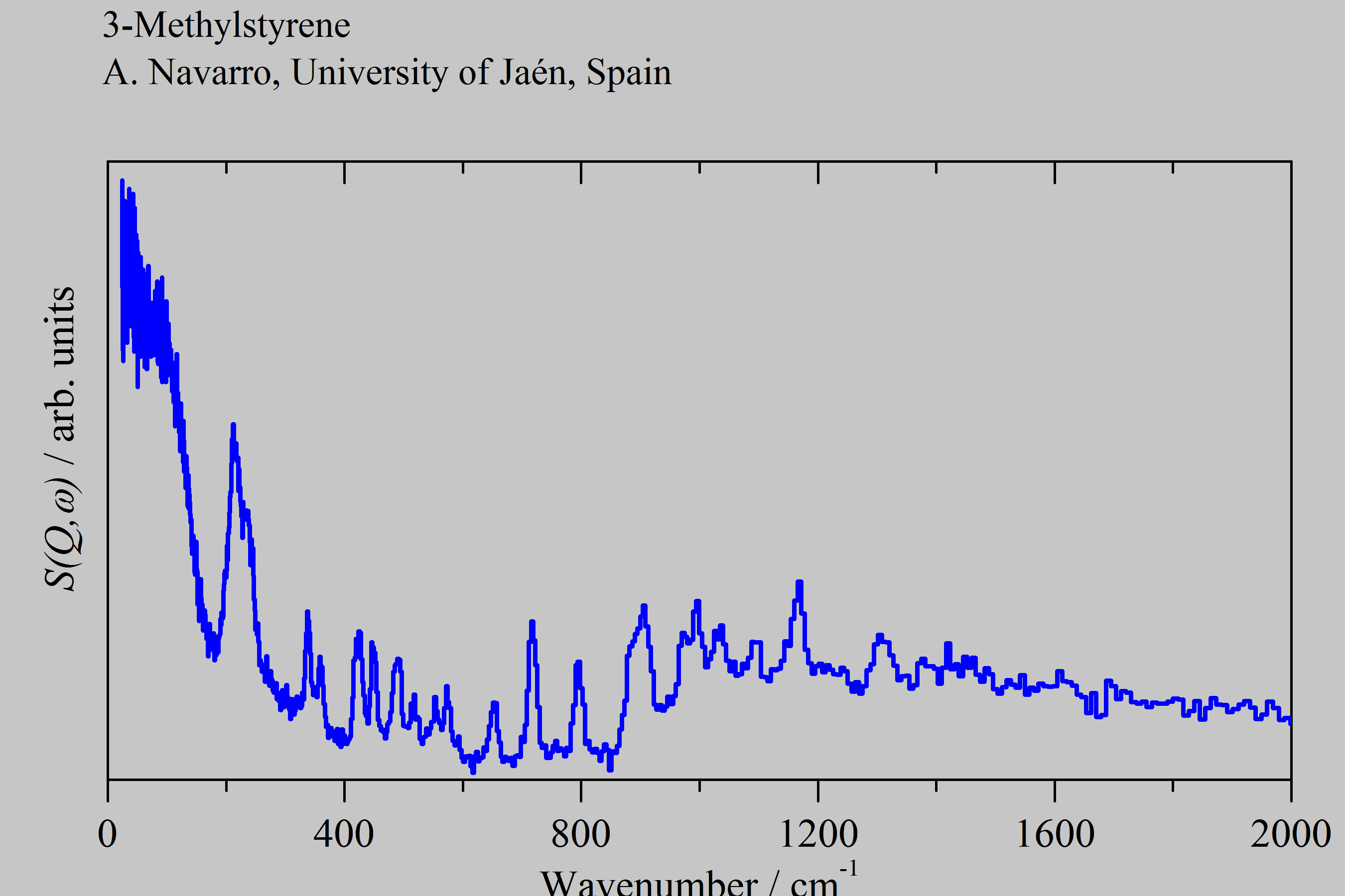 Inelastic Neutron Scattering spectrum of 3-Methylstyrene, C₉H₁₀, measured on the TOSCA instrument. Spectrum recorded at 40K.