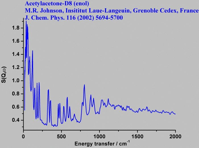 Inelastic Neutron Scattering spectrum of Acetylacetone-D8 (enol), CD₃C(OH)=CHCOCD₃, measured on the TFXA instrument.