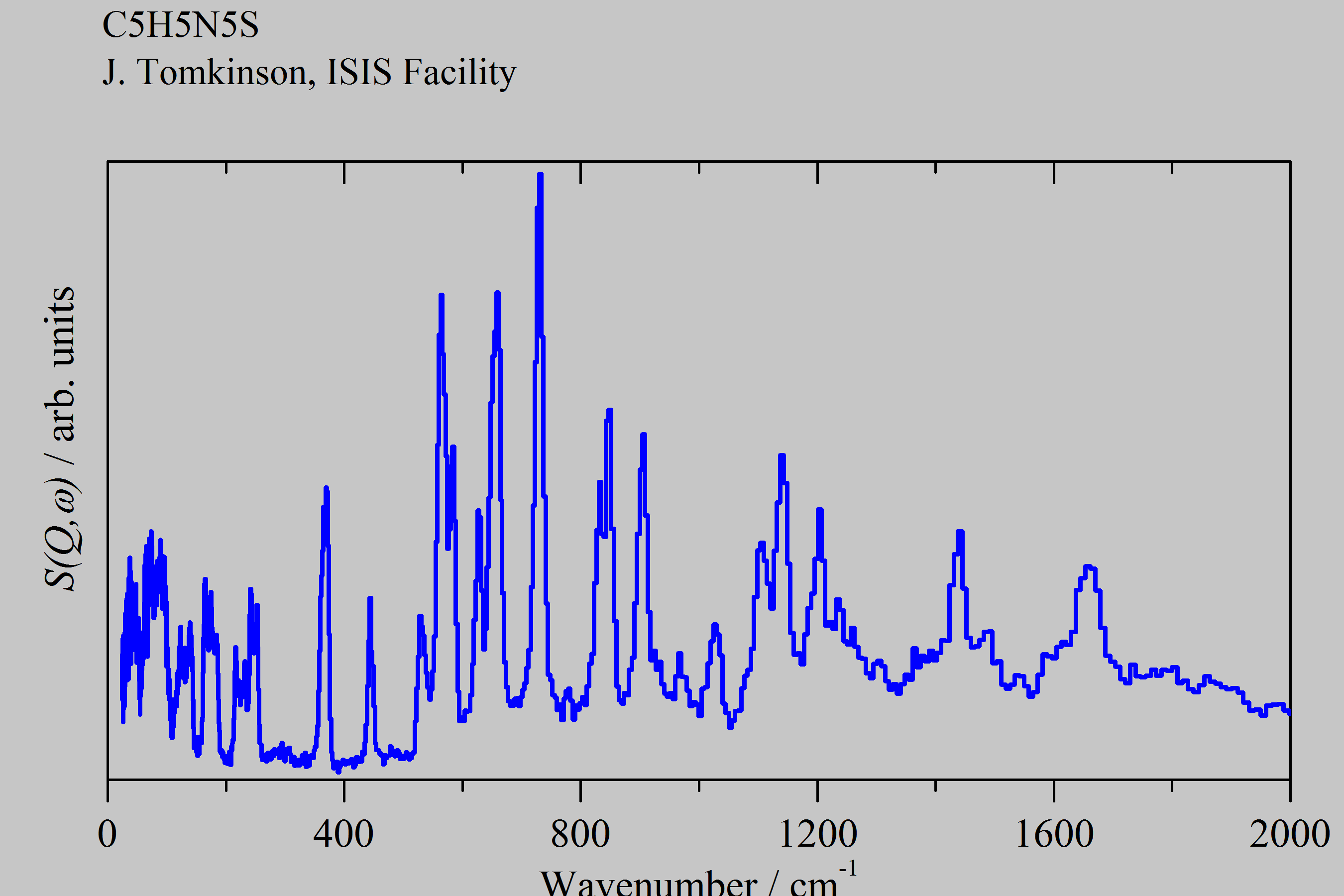 Inelastic Neutron Scattering spectrum of 6-Thioguanine, C₅H₅N₅S, measured on the TOSCA instrument.