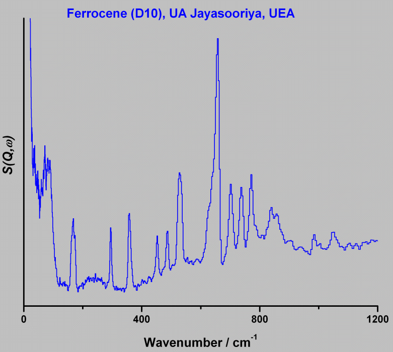 Inelastic Neutron Scattering spectrum of Ferrocene-D10, C₁₀D₁₀Fe, measured on the TOSCA instrument.
