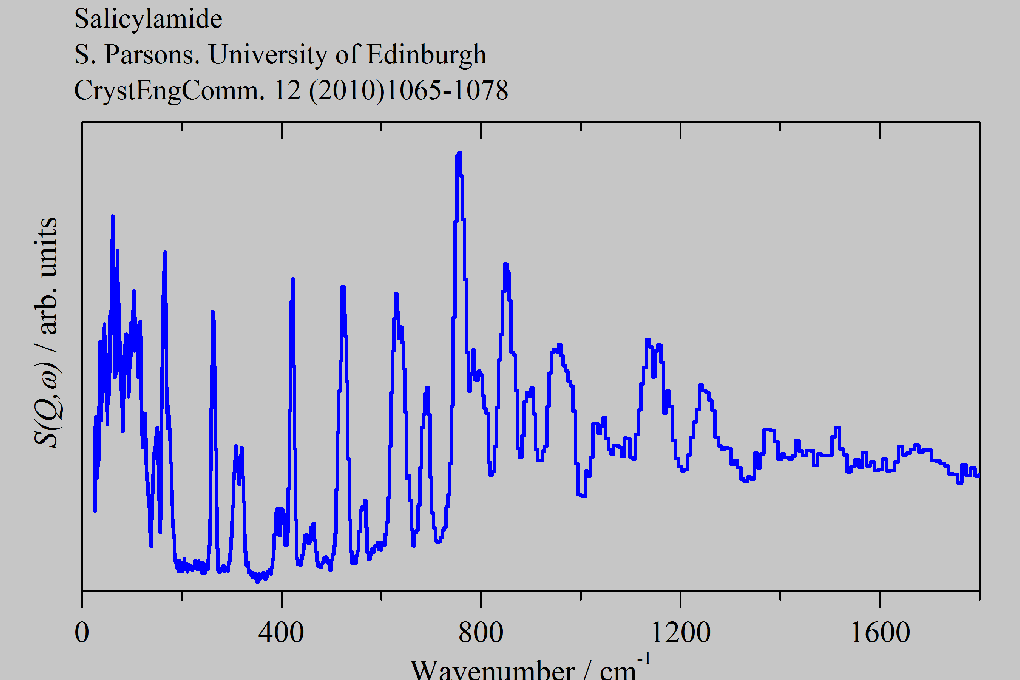 Inelastic Neutron Scattering spectrum of Salicylamide, C₇NH₇NO₂, measured on the TOSCA instrument.
