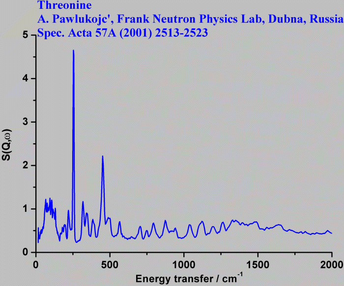 Inelastic Neutron Scattering spectrum of Threonine, CH₃CH(OH)CHCH(NH₂)CO₂H, measured on the TFXA instrument.