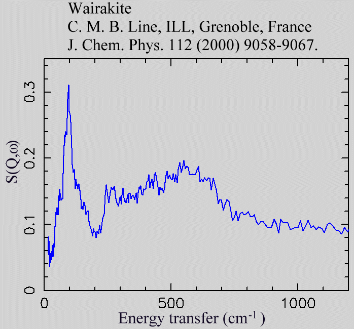 Inelastic Neutron Scattering spectrum of Wairakite, CaAl2Si4O12.2H2O, measured on the TFXA instrument. Exact formula Na0.4Ca0.9Al2.0Si4.0O12.