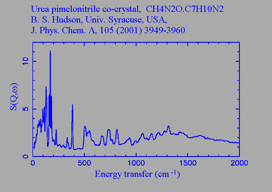 Inelastic Neutron Scattering spectrum of Urea pimelonitrile co-crystal, CH4N2O.C7H10N2, measured on the TOSCA-1 instrument.