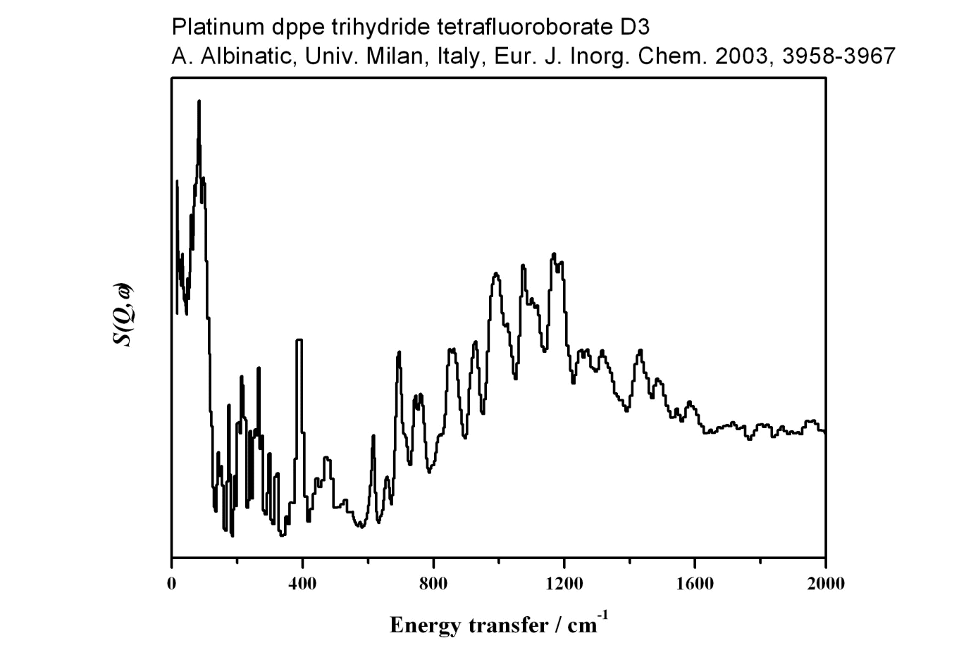 Inelastic Neutron Scattering spectrum of Platinum dppe trihydride tetrafluorobroate-D3, [Pt₂(dppe)₂(D)₃][BPh₄], measured on the TOSCA instrument. dppe = 1,2-Bis(diphenylphosphanyl)ethane.