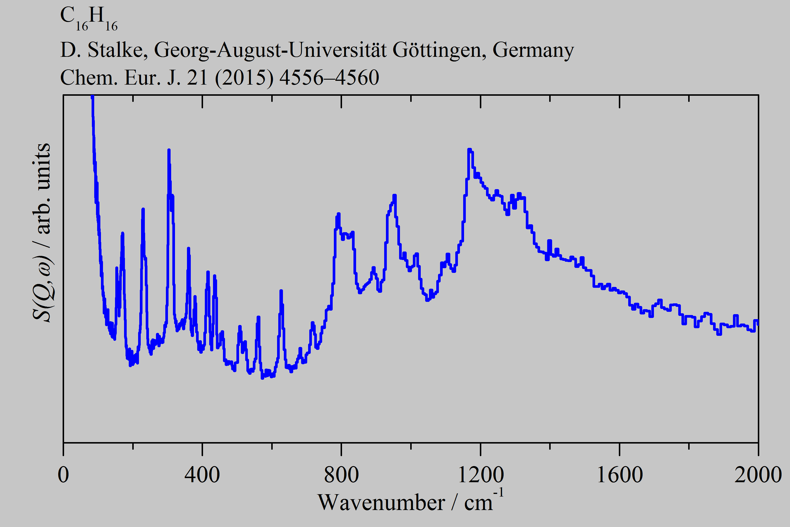 Inelastic Neutron Scattering spectrum of [2,2]-Paracyclophane, C₁₆H₁₆, measured on the TOSCA instrument. Centrosymmetric conformer (space group P42/mnm), stable above 60 K..