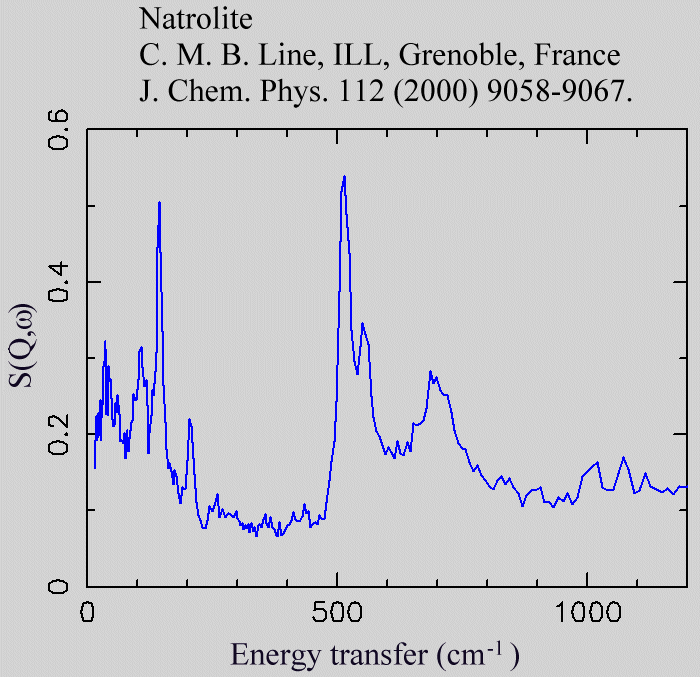 Inelastic Neutron Scattering spectrum of Natrolite, Na2Al2Si3O10.2H2O, measured on the TFXA instrument. Exact formula Ac0.03Na1.8Al2.0Si3.0O10.