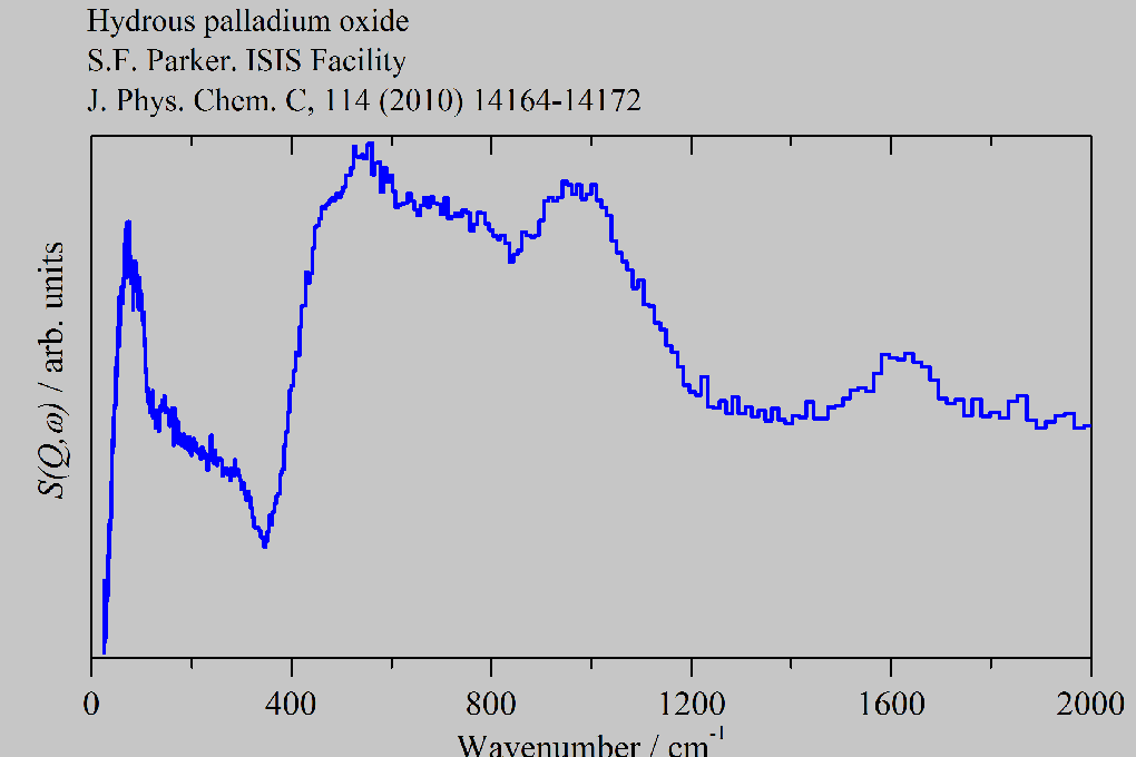 Inelastic Neutron Scattering spectrum of Hydrous palladium oxide, PdO.H2O, measured on the TOSCA instrument. Material is nanoparticulate PdO with a monolayer of hydroxyls and a water shell..